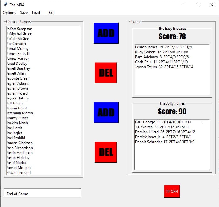 - The GUI displays a list of players and allows the user to create virtual teams, for a simulated match.