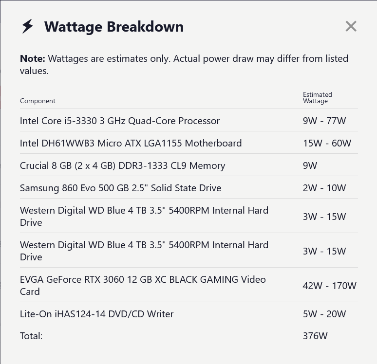 Now for the tricky part. This fancy new graphics card wouldn’t immediately be plug-and-play. The 200 W power supply already in the computer wouldn’t be able to handle the 170W power draw of the RTX 3060 and the rest of the components. PC Part Picker gave me the following summary: